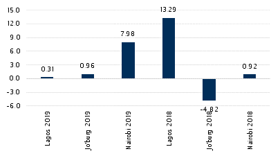 Performance of three SSA market indices (% chg ytd, local currency units)