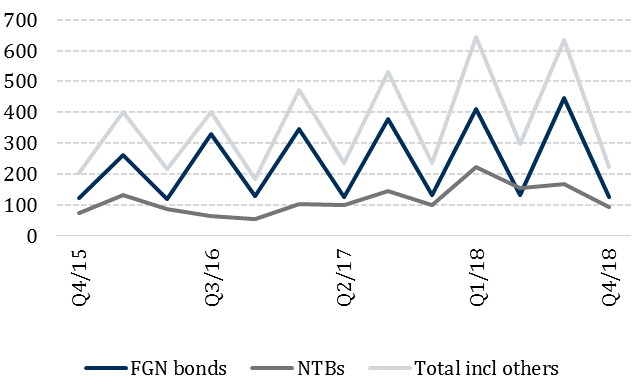 The data for the FGN’s domestic debt service in Q4 2018 offer some encouragement: the total cost was N13bn lower than in the year-earlier period, while the burden across the four quarters has started to stabilize. Interest paid on NTBs has eased due to externalization while the cost overall has benefited from a fall in borrowing costs. The next report (for Q1 2019) should reflect this year’s, post-election fixed-income rally.