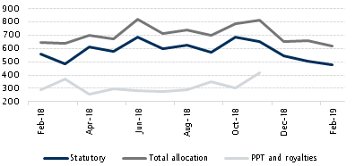 - In our chart we have added federally collected PPT and royalty payments. These CBN data lag the FAAC payouts by three months. Some correlation is discernible although the exercise would be more instructive if the threadbare commentary after the committee meetings still divided the gross statutory allocation between mineral and non-mineral revenue. For some reason, this practice ceased in mid-2018.