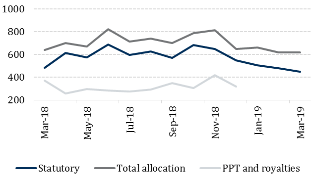 - In our chart we also show federally collected PPT and royalty payments. The CBN data lag the FAAC payouts by three months. Some correlation is visible although the exercise would be more useful if the thin official commentary after the committee meetings still divided the gross statutory allocation between mineral and non-mineral revenue.
