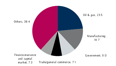 - Over the past twelve quarters the oil and gas sector has emerged as the largest recipient of loans from DMBs. In Q4 2018 the sector accounted for 23.5% of total credit. Lending to this sector has been subdued, which we attribute to the restructuring of existing loans to longer tenors.