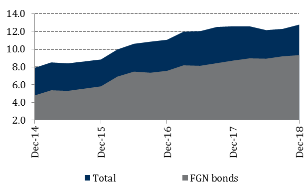 The FGN’s domestic debt stock totaled N12.77trn (US$41.6bn) at end-December, equivalent to 10.0% of 2018 GDP. The increase of N480bn in the quarter consists largely of promissory notes for N330bn issued to settle arrears due to oil marketers and sub-nationals. Subject to verification by the National Assembly, pro-notes and bonds totaling a further N2.4trn will be issued to clear late payments to contractors, non-oil exporters and other creditors. The debt stock also increased in Q4 following the issue of the FGN’s second N100bn sukuk.
