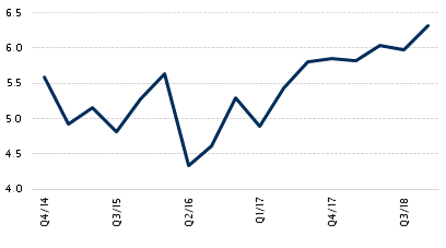 Net current transfers reached a record US$6.31bn in Q4 2018, an increase of 7.8% on the comparable year-earlier period. The fourth quarter generally provides the high point for the year because the diaspora likes to make transfers to family and friends for the holiday season. Workers’ remittances account for more than 95% of total transfers. The trend has been broadly positive over the past two years, reflecting the recovery of the global economy. The data naturally exclude transfers made through unofficial channels.