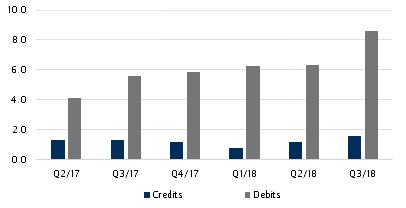 - A second reason for the marked increase in total services debits in Q3 from US$6.34bn to US$8.59bn can be found in the segment for personal travel: debits rose from US$1.78bn to US$2.52bn over the quarter.