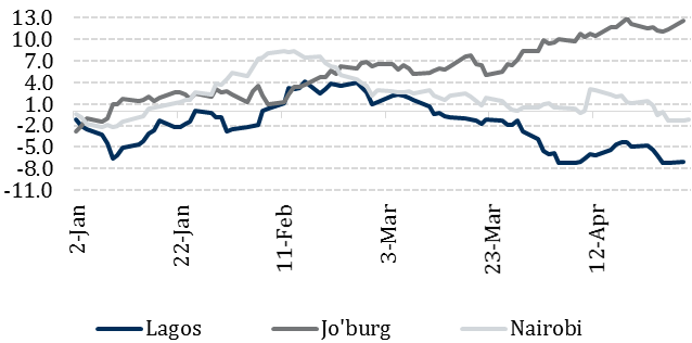 Performance of three SSA stock market indices (% chg ytd, local currency units)