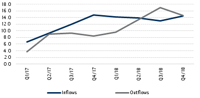 - In the two most recent quarters covered (Q3 and Q4 2018), there has been a net outflow on CBN transactions. In contrast, the balance is consistently positive for autonomous flows: the monies from FPIs are generally ‘recycled’ in CBN sales of fx to different segments of the economy (see below).