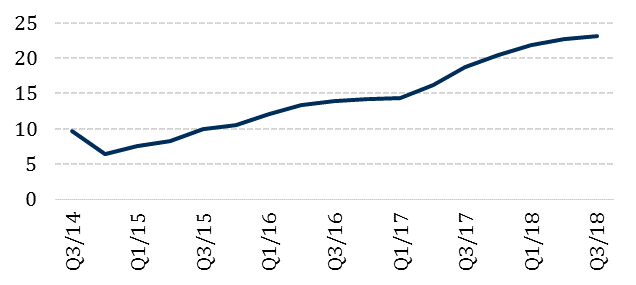 Nigeria has a large population, estimated as high as 198 million by the CBN in 2017, and largely untapped human capital. The latest labour force report from the National Bureau of Statistics shows a rise in the national unemployment rate to 23.1% in Q3 2018 from 22.7% recorded in the previous quarter. The recent International Labour Organisation (ILO) forecast of the sub-Saharan African unemployment rate is 7.2% for both 2018 and 2019. This implies that Nigeria’s unemployment rate is already significantly higher than average.